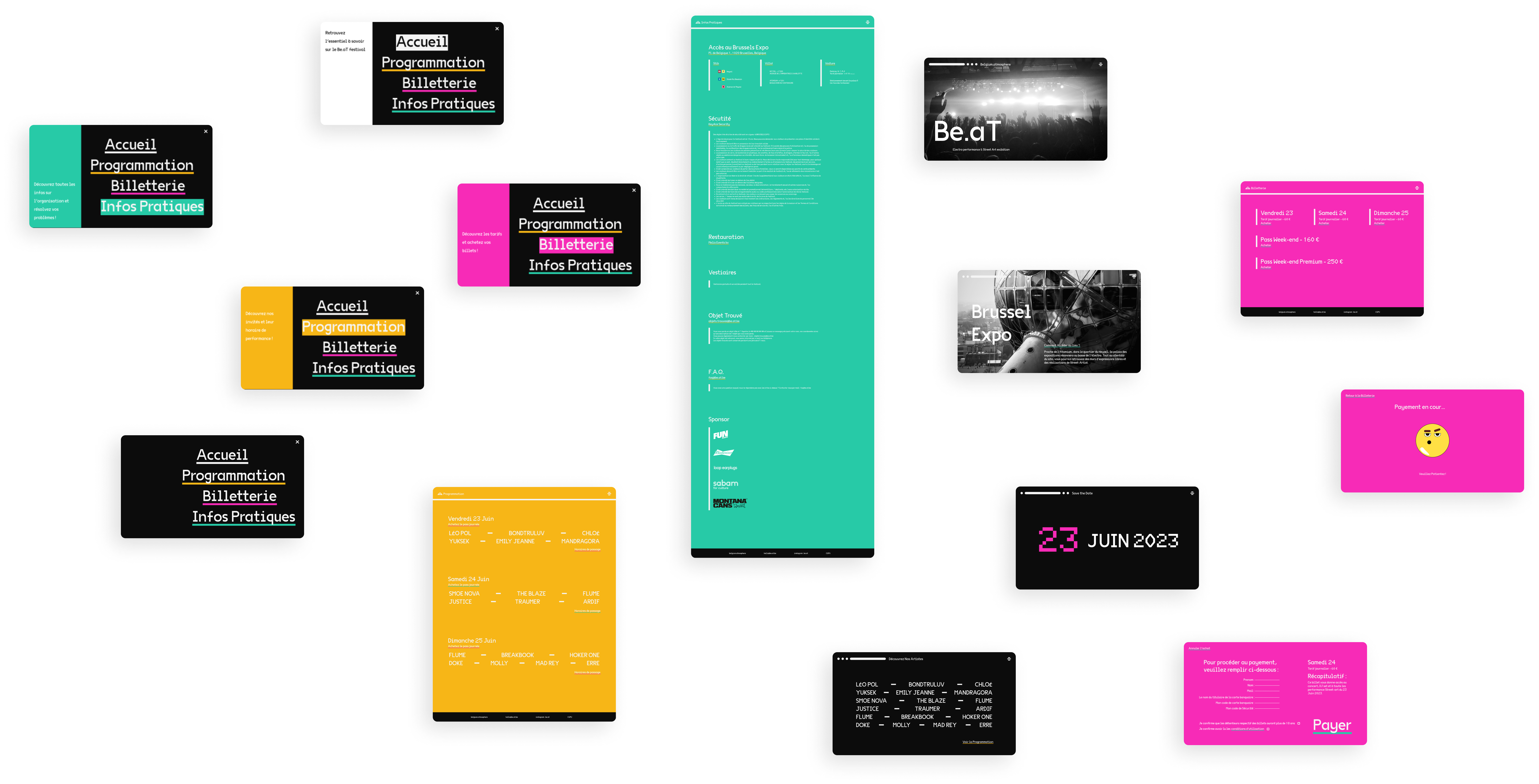 Pour la charte graphique, nous avons opté pour la typographie VG5000 de Velvetyne et une triade de couleurs vives. Pour le logo, nous nous sommes appuyés sur l'architecture de la façade du Palais 5 du Brussels Expo.